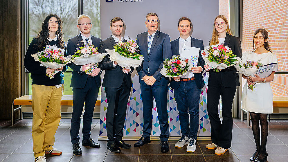 Foto (Universität Paderborn, Besim Mazhiqi): Prof. Dr. Andreas Siebe (Mitte) mit den Preisträger*innen der Universitätsgesellschaft: (v. l.) Hasna Mahmoud, Paul Steinmeier, Niklas Lamberty, Luca Jotzo, Nicole Grieger und Rose Sunil